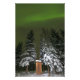 O Aurora Verde permanece suspenso acima do Outhouse coberto por neve. Salcha, Alasca