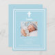 Um fundo azul claro, decorado com um quadro branco, e uma cruz branca Personalize e adicione um nome de foto e detalhes. Texto branco. 1 folha = 1 convite impresso de borda a borda.