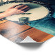 Jovem se divertindo tocando banjo. O banjo é um instrumento de quatro, cinco ou (ocasionalmente) seis cordas com uma fina membrana esticada sobre uma armação ou cavidade como ressonador. A membrana é tipicamente um pedaço de pele ou plástico animal, e o quadro é tipicamente circular. As primeiras formas do instrumento foram moldadas pelos africanos na América Colonial, adaptadas a partir de vários instrumentos africanos de design semelhante.
