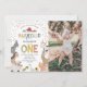 Um belo quintal de animais de estimação de zoo convites de primeiro aniversário com um simples fundo branco, uma foto do seu bebê, adoráveis animais de fazenda incluindo uma vaca, cabra, porco, burro, cavalo, coelho, pato e um galo, e um modelo de celebração de aniversário de criança que é fácil de personalizar.