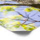 Num dia de primavera brilhante, uma coruja barrada pendurada numa árvore.