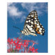 Uma foto de perto de uma borboleta colorida alimentando-se de uma flor contra um fundo azul do céu.