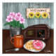 Arte digital. A mão desenhou a cena da safra com um sinal de girassol de boas-vindas, um vaso de flores cor-de-rosa uma xícara de café quente e duas rosquinhas com um rádio vintage ao fundo.