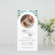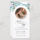Aprecie seus convidados com esta foto elegante Salve o marcador de data. Design com um fino floral de cor d'água pintado à mão em tons brancos, verdes e azuis empoeirados, contendo sua foto em um atraente quadro de sobreposição circular. A frase "Salve a Data" em caligrafia escrita à mão moderna. Área central superior livre caso você queira ter a opção de bater um todo, e embelezar um marcador com uma fita decorativa. Adicione seus nomes, data, local e quaisquer outras informações extras que você quiser. Voltar com detalhes florais de canto incluindo o logotipo de "nova data" de na moda com a frase "salvar a data" na caligrafia moderna, sua data, noiva e nomes de noivas.