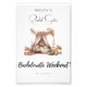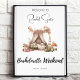 Este sinal de boas-vindas do Fim de Semana Festa de solteira com um tema de glamping exude um ar de romance e aventura, convidando convidados para uma memorável fuga ao ar livre. O design é elegante e caprichoso, com atenção cuidadosa aos detalhes. O ponto focal do convite é uma cama rosa macia, belamente ilustrada, que toma palco central. Esta cama é perfeitamente desenhada com uma copia cortada com flores delicadas, pintadas à mão em vários tons de rosa, criando uma atmosfera sonhadora e encantadora. A cobertura parece brilhar suavemente no vento, acrescentando uma sensação de movimento e romance à cena. Acima da cama, um espalhamento de lanternas flutuantes de cor-de-rosa suave e ouro adiciona um toque mágico. Estas lanternas parecem pairar no ar, lançando um brilho quente, convidando e simbolizando a luz orientadora da amizade e da aventura. Eles criam um ambiente etéreo e caprichoso, perfeito para uma experiência de glamping sob as estrelas.