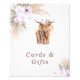 Boho Lilac Floral Highland Cow Sign Bohemian inspirou um chá de fraldas com uma vaca e um bezerro, dois arranjos florais com grama pampas, uma imagem caligráfica moderna e um arco de cor lilás.
