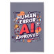 This striking digital vector design showcases the phrase “Human Error, AI Approved” in bold, eye-catching typography with vibrant purple, red, and orange accents. Surrounded by abstract mechanical and geometric elements, gears, and robotic icons, it evokes futuristic tech and AI themes. Perfect for fans of digital art, tech humor, and modern infographic aesthetics, ideal for making a statement on apparel and accessories.