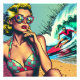 Bonito loira loira sentada na praia com óculos escuros assistindo um surfista gostoso em cores vintage em um estilo cômico de pop-art.