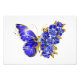 Borboleta de flores cinza, azul, safira, espumante com asa decorada com flores preciosos azuis com folhas de ouro sobre fundo branco.