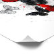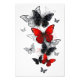 Bando de borboletas voadoras, realistas, vermelhas e pretas em fundo branco com gotas de tinta.