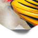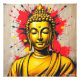 Uma estátua Buda ouro é representada em frente a um pano de fundo vibrante de contornos vermelhos e amarelos, criando um contraste visual impressionante. A expressão serena no rosto de Buda adiciona um senso de paz entre as cores dinâmicas.
