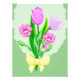Um monte de flores, tulipas e pansias amarradas por fita amarela. Também uma bela poster.