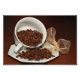 Mande um alô com esta fotografia de uma xícara de café branca e um pires com grãos de café a derramar.