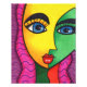 Este desenho abstrato é de uma cara de menina com cores vibrantes de amarelo e verde com cabelo rosa, criando uma peça de arte dinâmica e energética. seus olhos são uma bonito sombra de azul que brilha com curiosidade e calor. Seus lábios são uma sombra ousada de vermelho, mostrando confiança. No geral, uma abstrato ilustração divertida de uma garota encara celebrando cor, energia e beleza.