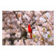 Um cardeal-norte (Cardinalis Cardinalis) ave empoleirada em um galho de árvore com flores de cereja cor-de-rosa ao fundo.