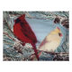 A male and female Cardinal sit perched in the snowy branches of a pine tree on a winter day with gray blue cloudy sky by artist Jason Girard.