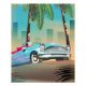 Automóvel verde de espuma-do-mar retrô com paisagem urbana e palmas.