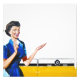 Imagem engraçada de uma dona de casa mostrando orgulhosamente sua lavadora e secadora. Cor retrorreflectora brilhante.