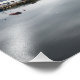 Foto impressão das coloridas casas portuárias de pesca da cidade de Portree, com reflexo na água do mar na ilha de Skye, na Escócia, Reino Unido.