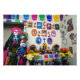 Um dia muito colorido, caseiro, da festa dos mortos, com uma mãe catrina e uma criança vestida com um autêntico artesanato mexicano. O altar de frenda exibe flores da estação, papel picado e borboletas monarcas.