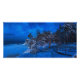 Cena de inverno noturna com neve coberta de pinheiros em uma lua à noite estrelada. Vista panorâmica de floresta de coníferas com caminho de madeira perto da costa marítima contra belos céus noturnos com estrelas