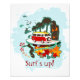 Uma ilustração divertida e moderna de uma cena de praia tropical com palmeiras, oceanos surfs com surfistas, uma linda mulher nua de biquíni, lindas flores e um velho ônibus hippy van. Excelente para o amante da praia.