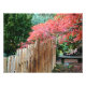 Impressão de fotos que mostra a imagem fotográfica de um galho de folhas vermelhas de mapa japonesas penduradas sobre uma cerca de bambu ornamental em um jardim japonês. Personalize o tamanho do seu impressão, conforme desejado. Foto: Point Defiance Park Jardim Japonês
