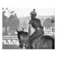 Este cavalo estava respirando no dia de abertura em Saratoga com uma cavaleira de exercícios femininos. Sinta o poder e o entusiasmo nesta emocionante fotografia de cavalo e cavaleiro. A foto é terminada em preto e branco para criar o humor matinal com cavalo e cavaleiro. Fleetphotoname