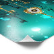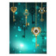 Chaves Douradas e antigas com engrenagens e marcadores penduram em correntes douradas sobre fundo verde luminoso.