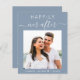Convite de casamento azul, tudo-em-um, amigável e com orçamento, com a sua foto, "Feliz Nunca Depois" numa mistura de simples tipografia branca e um guião branco-chique com baloiços, e seus primeiros nomes e sua data de casamento juntos por um coração. No verso, personalize seu convite em tipografia branca elegante e insira seu endereço no site do casamento para criar um código QR para seus convidados digitalizarem para RSVP on-line e para obter detalhes adicionais de casamento, como acomodações e instruções. Este papel semirbrilhante do orçamento é semelhante em peso ao papel fotográfico. As versões tradicionais de estoque de cartão mais pesado também estão disponíveis (mensagem para o link).