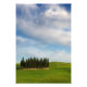 Impressão de fotografia vertical de um grupo de ciprestes numa paisagem com colinas verdes e flores amarelas sob lindas nuvens brancas perto de Torrenieri, no Vale de Órcia, na Toscana, Itália.