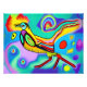 "Cockerel Psicodélico". Um cockerel corajoso e estridente. Uma jornada psicodélica aguarda como um cockerel Technicolor toma o palco central, sua presença vibrante pulsando com energia surreal e vibração. Em cores brilhantes de blues, púrpuras, amarelos, vermelhos e verdes.