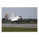 Com a calha de arrasto descontinuada, a descoberta do ônibus espacial pousa na pista 33 no Shuttle Landing Facility no Kennedy Space Center, na Flórida, em destaque com Cape Canaveral.