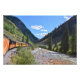 "Narrow Gage Train Return to Durango, Colorado" por Catherine Sherman. O trem de Durango & Silverton Narrow Gage segue o rio Animas no seu retorno ao depósito de Durango. A ferrovia é uma ferrovia de 3 pés (914 mm) de patrimônio de bitola estreita que opera 45,2 milhas (72,7 km) de via entre Durango e Silverton, no estado norte-americano do Colorado. A ferrovia é um Marco Histórico Nacional designado federalmente e é também designada pela Sociedade Americana de Engenheiros Civis como um Marco Histórico de Engenharia Civil. Este comboio histórico está em funcionamento contínuo entre Durango e Silverton desde 1882, carregando por trás das locomotivas a vapor vintage e indígenas do material circulante até à linha. A linha foi construída para transportar minério de prata e ouro das Montanhas San Juan, no sudoeste do Colorado, mas os passageiros logo perceberam que a visão era ainda mais valiosa. A ferrovia vai 45 milhas (72 km) do estaleiro de Durango até Silverton, atravessando o rio Animas cinco vezes durante a viagem. Quando os trens chegam a Silverton e descarregam os passageiros, o trem é ligado, de volta ao centro para pegar os passageiros de volta, e faz a viagem de volta a Durango. Comboios programados de uma forma só levam 3½ horas para rodar as 45 milhas (72 km) de cada sentido, com uma escala de 2¼ horas em Silverton. Uma via férrea de bitola estreita (via férrea de bitola estreita nos EUA) é uma via férrea com bitola inferior à norma 1,435 mm (4 pés 8 1/2 pol). A maioria das linhas de bitola estreita está entre 600 mm (1 pé 11 5/8 pol) e 1.067 mm (3 pés 6 pol). Uma vez que os caminhos de ferro de bitola estreita são normalmente construídos com curvas mais apertadas, gabaritos de estrutura mais pequenos e carris mais leves, podem ser menos dispendiosos de construir, equipar e operar do que os caminhos de ferro de bitola normal ou ampla (especialmente em terrenos montanhosos ou difíceis).