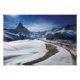 Foto impressão do famoso comboio ferroviário de Gornergrat vermelho que atravessa a neve que sobe as montanhas dos Alpes, com vista à majestosa montanha do Monte Matterhorn acima da estação de esqui Zermatt no inverno suíço em Canton Valais, Suiça.