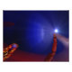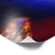 Um desenho de um planeta com um cometa passando e um trem viajando em direção a ele.