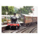 Um trem a vapor bem restaurado e carruagems de uma era passada chegando à estação de trem.