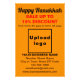 Feliz Hanukkah! Um feriado para comemorar e obrigado pelas bênçãos que recebemos. É também um dos feriados para anunciar a sua empresa. Papel fotográfico personalizável com o Hanukkah Sale, o seu nome comercial e outras informações. Papel fotográfico que você pode usar como material de marketing para atrair mais clientes. Personalize-o e use-o para convencer mais clientes a comprar de seus produtos ou clientes a gostar de seus serviços neste Chanucá. As cores design são textos pretos e vermelhos sobre fundo cor de laranja. O conteúdo é saudação de Hanukkah feliz, textos de venda com desconto percentual que você oferecerá, datas de venda, seu nome comercial, logotipo, endereço, número de telefone, e-mail e site ou sua página de mídia social de negócios. Verifique a aparência após carregar o logotipo e digitar textos. Se a aparência lhe agrada, você pode colocar seu pedido agora. Se você precisar redimensionar e mover o logotipo e as mensagens para o ajustado neste papel fotográfico ou no tamanho e estilo que você escolherá, mude na ferramenta design. Você também pode fazer outras alterações na ferramenta design de acordo com a aparência deste papel fotográfico que você prefere, como alterar a cor de fundo, a cor da fonte e o estilo da fonte. Feliz Hanukkah! Desejando mais vendas neste feriado.