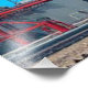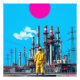 Uma paisagem industrial complexa é representada por estruturas de reboque silenciadas contra um céu verde. Um círculo azul em negrito contrasta com as nuvens texturizadas no fundo.