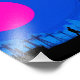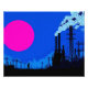 Uma paisagem industrial complexa é representada por estruturas de reboque silenciadas contra um céu verde. Um círculo azul em negrito contrasta com as nuvens texturizadas no fundo.