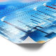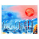 Uma paisagem industrial complexa é representada por estruturas de reboque silenciadas contra um céu verde. Um círculo azul em negrito contrasta com as nuvens texturizadas no fundo.