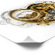 Cardíaco mecânico, volumétrico e steampunk com manômetros de pressão, de aço e de ouro sobre fundo branco. Estilo Steampunk.