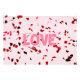 Corações vermelhos e roxos voam no ar contra o fundo rosa. Saudações do Dia dos Namorados! Alegria e amor estão no ar! Texto AMOR em alguns produtos. Camisetas, impressões e presentes para diversão e bom humor e para celebrar o Dia de São Valentim