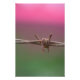 Macro de uma cerca de arame farpado com as cores dos campos tulipas no fundo.