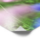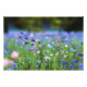 Um campo de flores de milho em tons de azul profundo e pálido, roxo, lavanda e rosa, com folhas verdes pálidas.