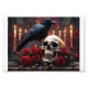 Um corvo sentado num crânio com pano de fundo de velas