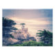 Uma solitária árvore Monterey Cypress se posiciona orgulhosamente sobre um penhasco rochoso, olhando para uma vasta extensão de oceano em Pebble Beach, Califórnia. O céu é uma mistura suave de rosa e azul, sugerindo um nascer do sol sereno. A imagem é capturada de uma perspectiva levemente elevada, mostrando a beleza robusta da linha costeira. O primeiro plano apresenta um verde exuberante e rochas texturizadas, acrescentando profundidade e dimensão à cena.