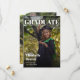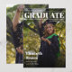 Um anúncio de formatura moderno que parece uma capa de revista. Há uma garota formada jogando confete. Na parte superior, o título Graduado é escrito em letras grandes e negrito. Acima do título e da primeira linha, à esquerda, está o nome da universidade; abaixo do título e da segunda linha, à direita, está a turma/ano. Na parte inferior, o nome deles é escrito em letras negrito, com as informações sobre os planos futuros em letras brancas menores abaixo. Todo o texto é branco. Há gradientes sobre a foto, tanto na parte superior quanto na inferior, para tornar o texto branco mais visível.