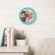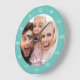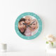 Crie um relógio especial, tipo redondo ou quadrado. O design de relógio personalizado apresenta fontes modernas simples sobrepostas à foto da família de sangramento do seu cheio. Um relógio personalizado é uma ideia única de presente de Natal para avós, novos pais ou um presente divertido para recém-casados decorando juntos sua primeira casa.
