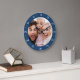 Crie um relógio especial, tipo redondo ou quadrado. O design de relógio personalizado apresenta fontes modernas simples sobrepostas à foto da família de sangramento do seu cheio. Um relógio personalizado é uma ideia única de presente de Natal para avós, novos pais ou um presente divertido para recém-casados decorando juntos sua primeira casa.